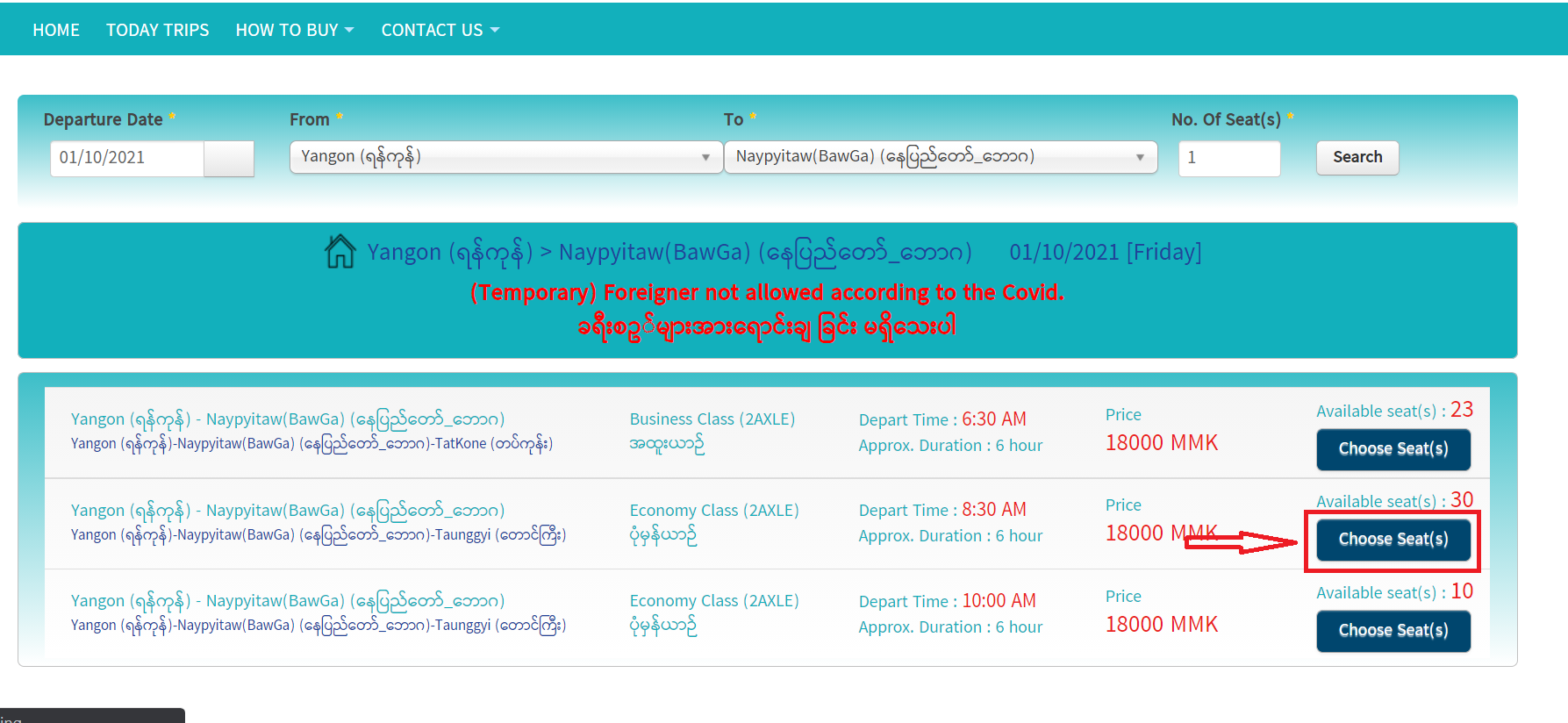 ၂။ လက်မှတ်ဝယ်ယူရန် မိမိသွားရောက်လိုသော ခရီးစဉ်အချိန်ကို ရွေးချယ်ပြီး Choose Seat(s) ကို နှိပ်ပါ။
