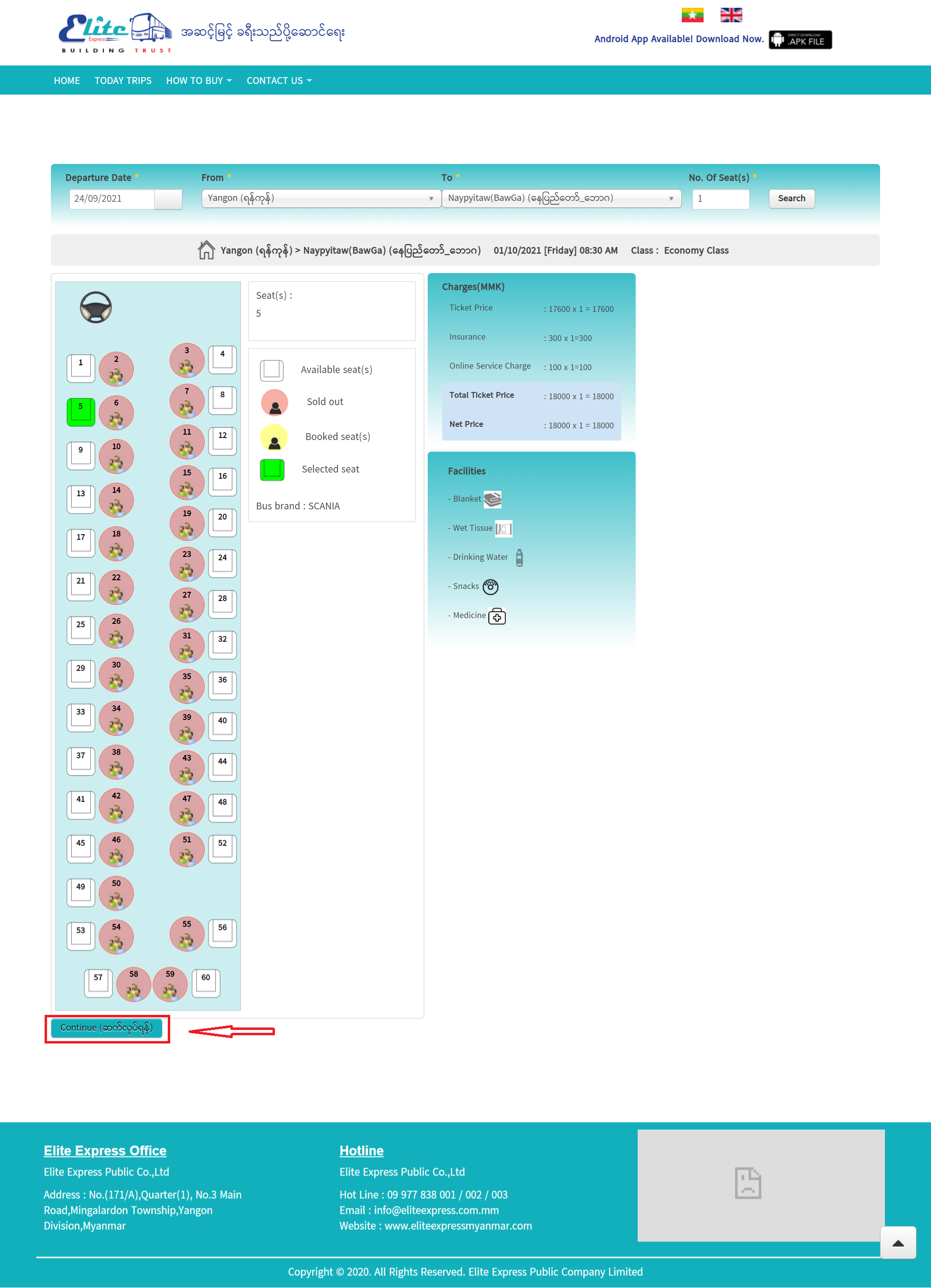 ၃။ ဝယ်ယူနိုင်သော အဖြူရောင်ခုံများမှ မိမိကြိုက်နှစ်သက်ရာ ခုံကိုနှိပ်ပြီး Continue ကိုနှိပ်ပါ။