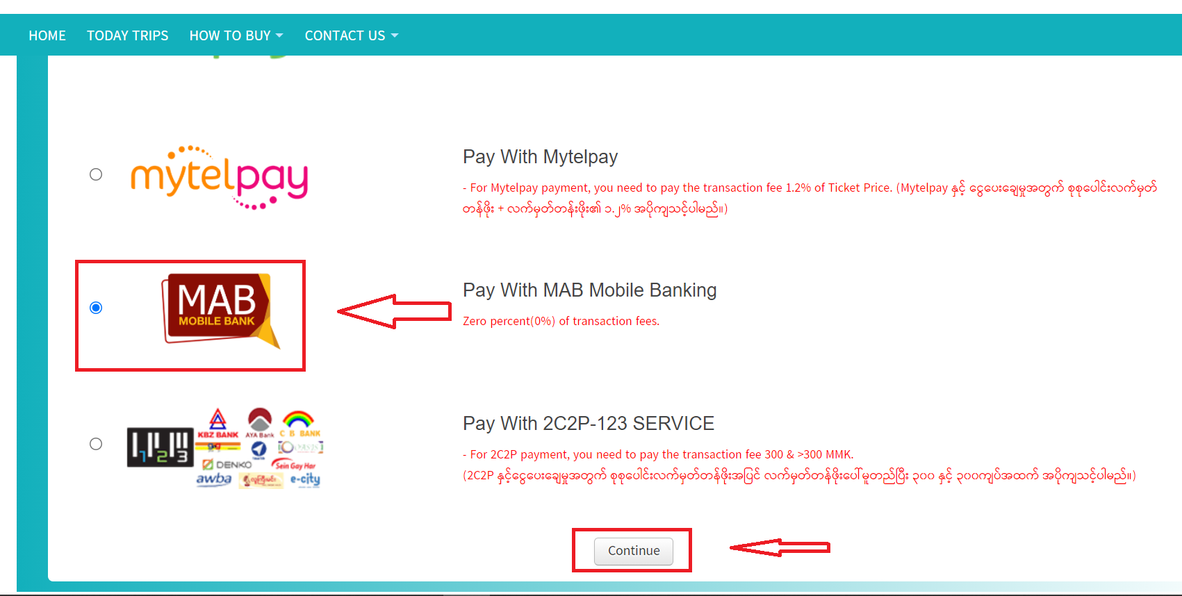 ၅။ MAB mobile banking အားရွေးချယ်၍ click နှိပ်ပေးပြီး "Continue" အား ထပ်မံနှိပ်ပေးပါ။