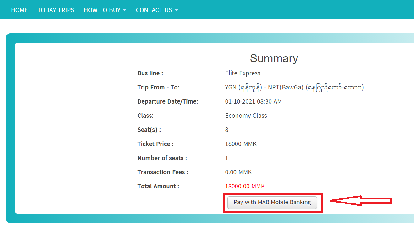 ၆။ မိမိထည့်သွင်းခဲ့သော အချက်လက် အကျဉ်းချုပ်အား ထပ်မံစစ်ဆေးပြီးနောက် "Pay With MAB mobile banking" ကို နှိပ်ပေးပါ။