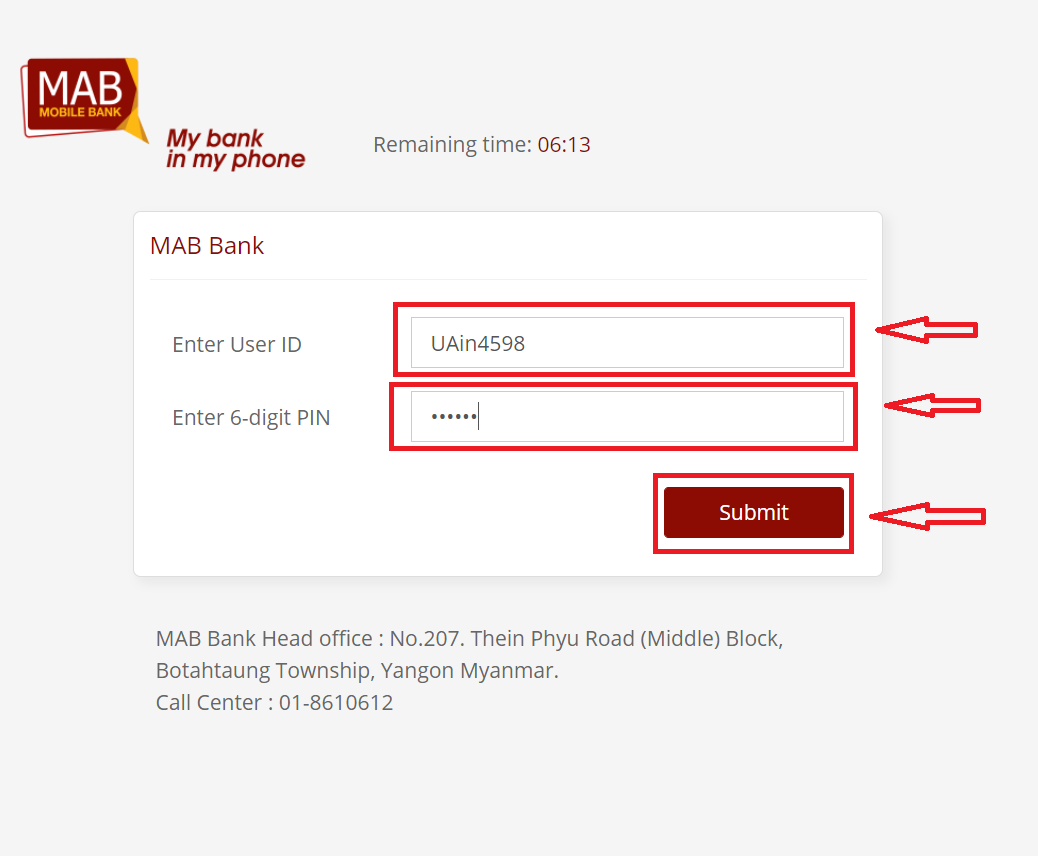 ၇။ မိမိ MAB mobile banking wallet account ပြုလုပ်ခဲ့စဉ်က ရရှိထားသော User ID နှင့် PIN number အား ထည့်သွင်းပေးပြီး Submit နှိပ်ပေးပါ။