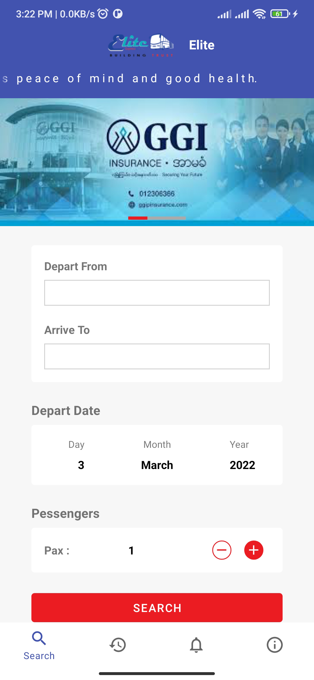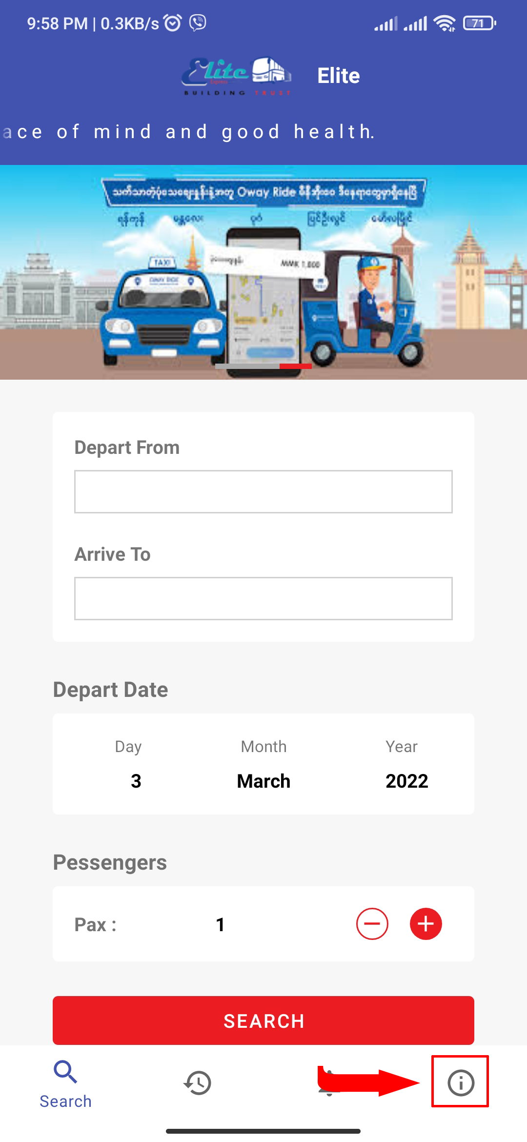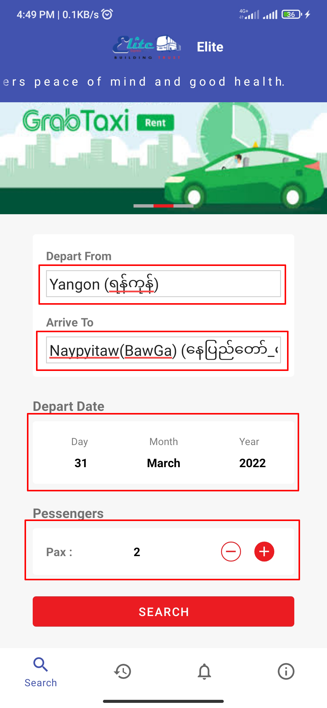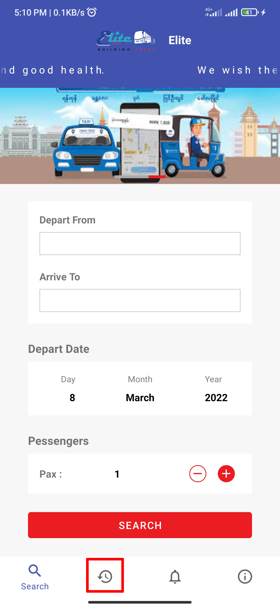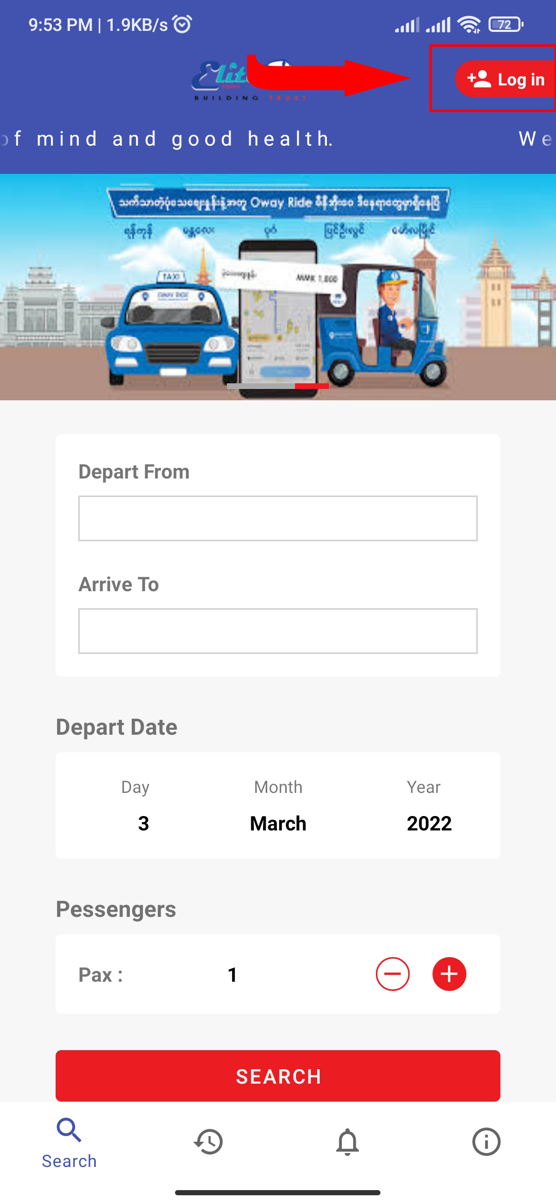 Select Depart From (the place where you want to depart), Arrive To (the place where you want to go), Depart Date (the date when you want to go), Pax (the number of seats/passengers you want to book) and then click 'SEARCH'.