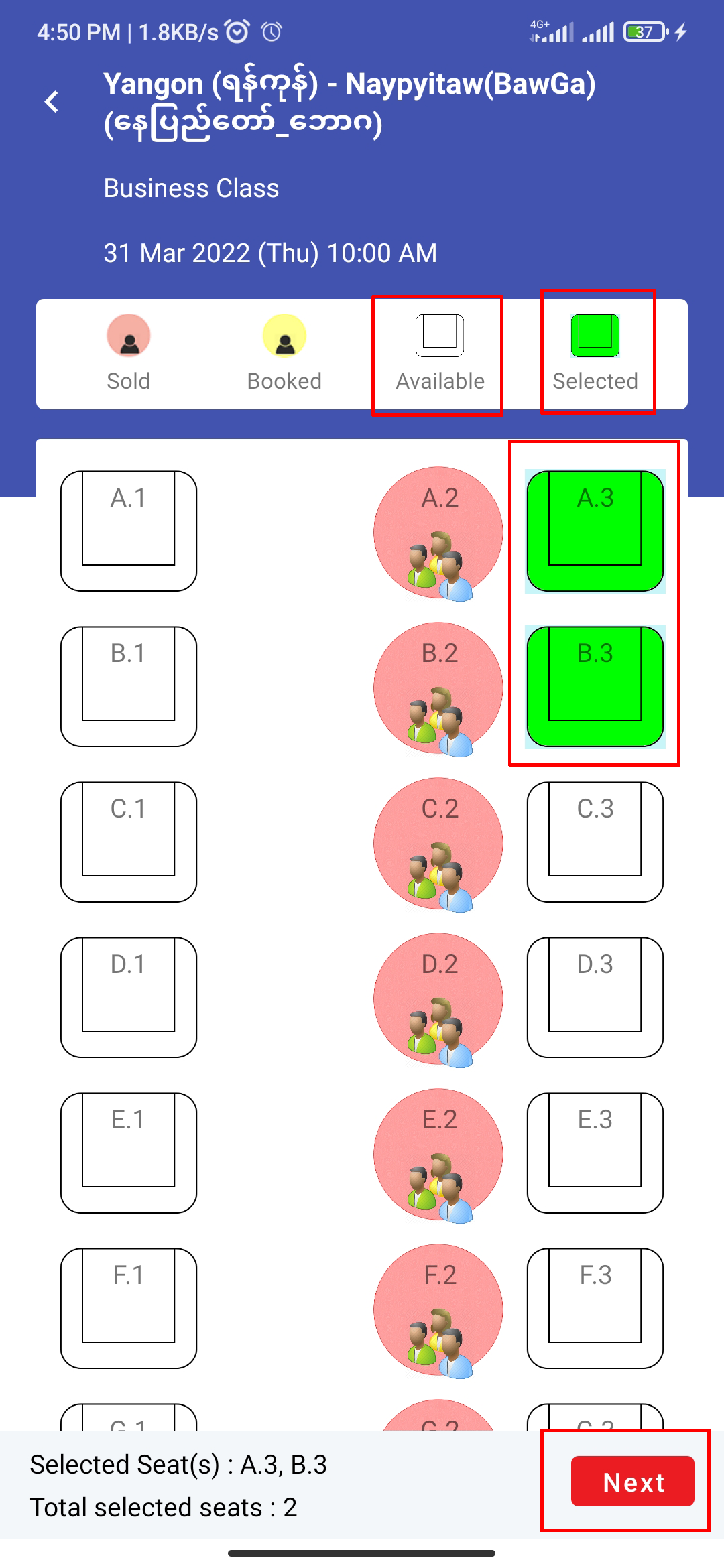 Select the available(white background) seat(s) and then they will change to the green background. Then click 'Next'.