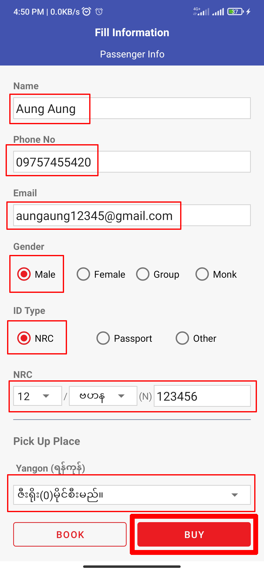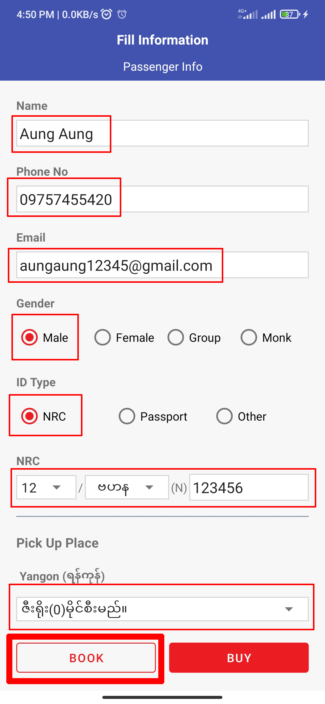 The 'Passenger Info' will shows as your registered info as default. If the passenger is another person, you should edit the specific info in the specific fields. Then click 'BOOK'.