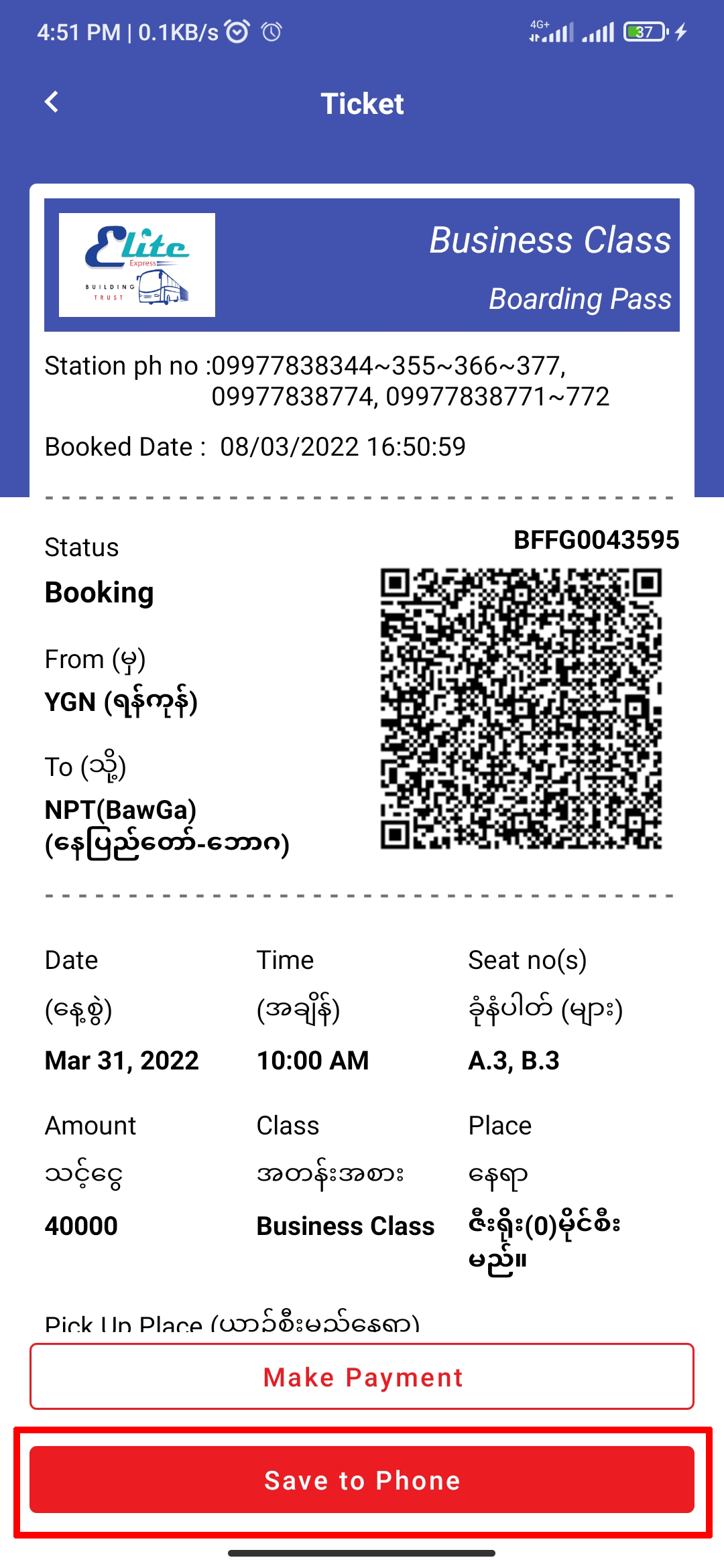 When your booking is successful, you can save your booked ticket by clicking 'Save to Phone'. If your want to confirm your booking ticket, you can click 'Make Payment'. If not, click '<' to go to the trip search screen (back icon at the top-left corner of the screen).