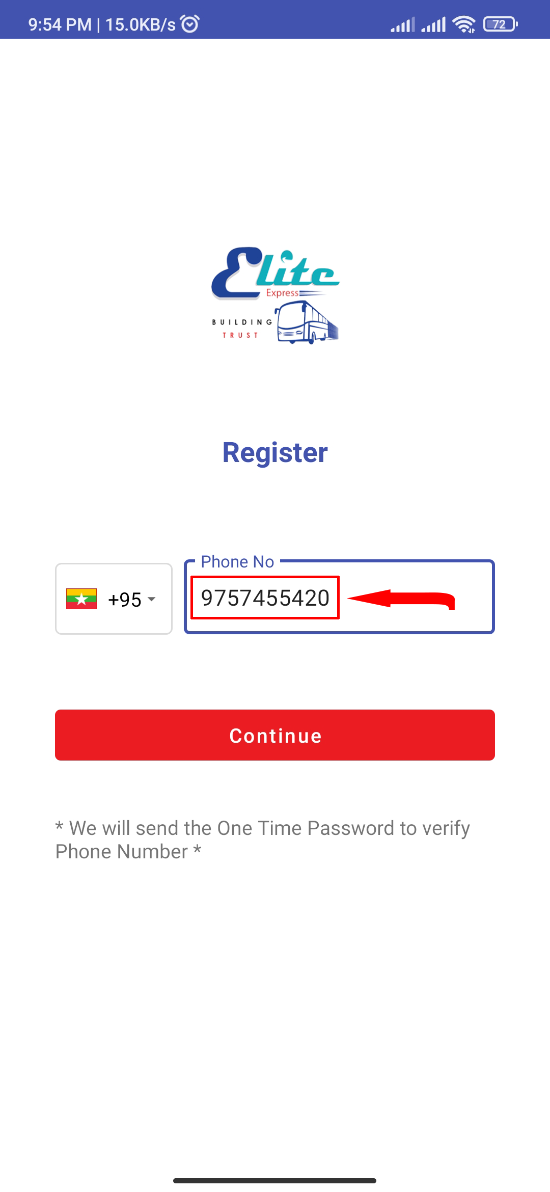 Enter your mobile phone number which should start with '9' and then click Continue.