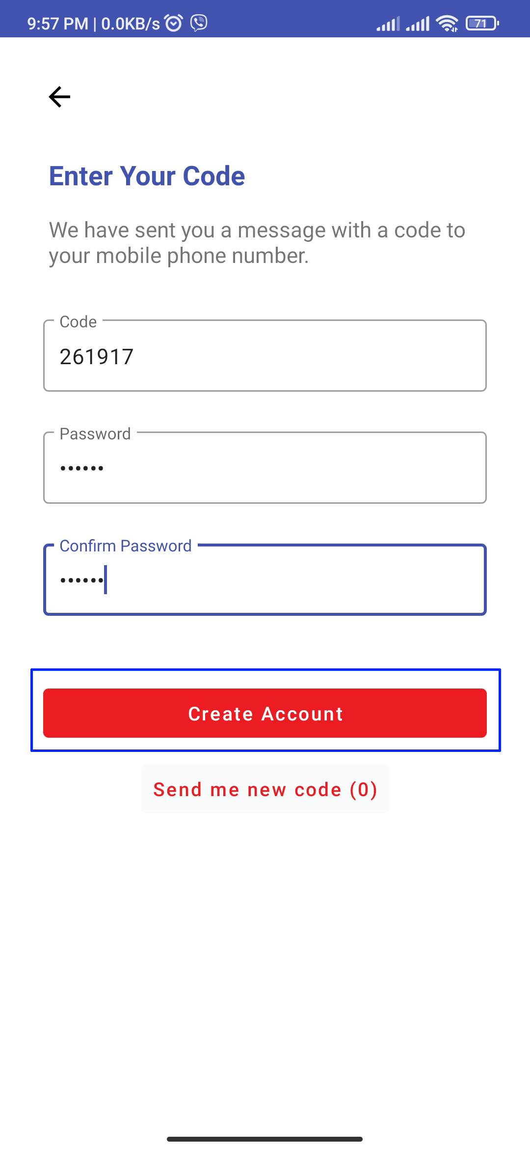 Enter the 6 digits OTP code in Code field and enter the Password and Confirm Password which should at least 6 characters. Then click "Create Account".
